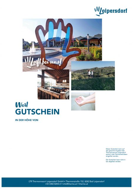 Unsere Wertgutscheine können auf das gesamte Angebot des Thermenresorts Loipersdorf sowie für Nächtigungen, Pakete und Freizeit-Angebote in unseren Partnerbetrieben eingelöst werden.